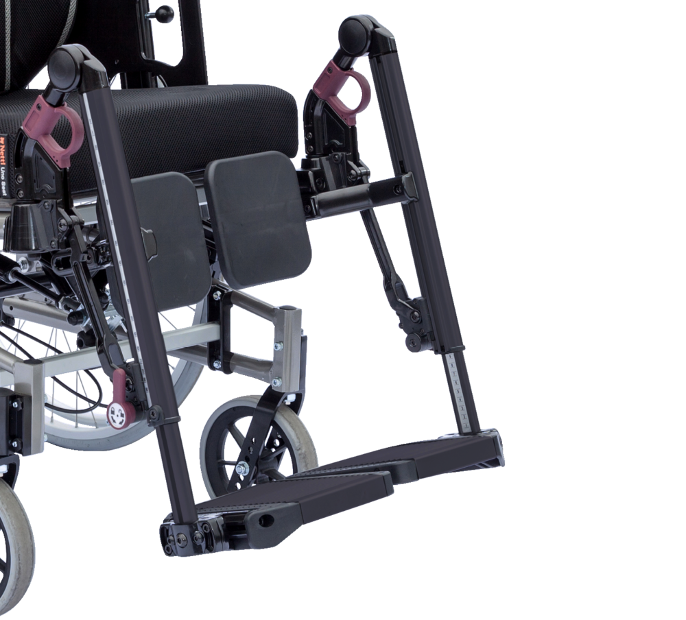 All wheelchairs should have the option to place the feet of the user in a less than 90 degrees angle to avoid the tension of the hamstrings pulling the pelvis out of position, prevent decubitus, and prevent pain and discomfort due to incorrect position of the user.