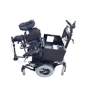 To be able to take bipap and other equipment on a trip, a storage basket has also been made with easy access to these necessities. It makes it easy for helper and family. They can also maneuver the chair with the joystick on the push bar if necessary.